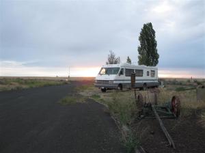 I didn’t think I’d have much to write about tonight, since today was a dull, rainy day and we spent all of it driving. The only interesting place we stopped was at large produce and chocolate market somewhere along Hwy 84 or Hwy 385. They’ve all just melted together by now. We did buy some nice fruit and a couple of ears of corn for supper. Once we’d crossed into Washington State the terrain became very flat and monotonous. Earlier in the day there had been RV Parks about every five miles along the road. At six o’clock when we decided it was about time to camp for the night, none could be found. The few small towns that we passed seemed to have only a hotel or two. By the time we saw a sign for Lind that indicated there were “services” we were in need of gas, so we drove the two miles into town. That’s when the trip became more interesting!