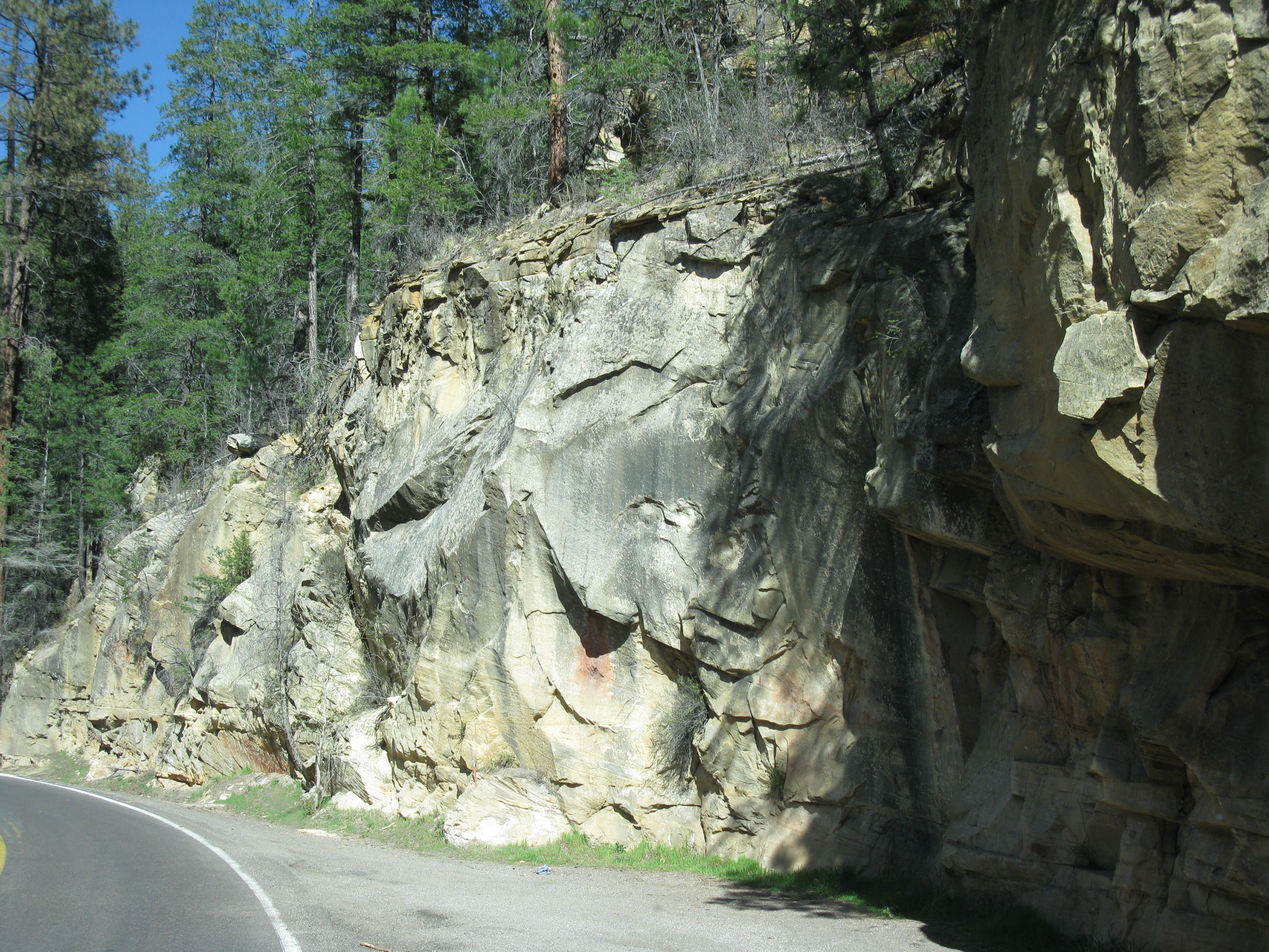 To add to the adventure, a small tree branch brushed the side of our vehicle and soon the awning began to rattle. As soon as we came to a pull-off Jim got out to check it. The wind was so strong that it grabbed the door nearly out of Jim’s hand as he attempted to exit the RV. He discovered that the blow from the tree had dislodged the awning lock and part of the canvas had come unrolled and was flapping in the wind. There was no way that we could battle the winds to get the awning down, but with some effort, Jim managed to get it rolled back up and locked into place using the long armed hook. We then wrapped Velcro straps around the arms to make sure they didn’t come loose again. We carried on as the road became more twisty with several switch-backs, until we were back onto I-17 and then I-40, heading towards Flagstaff. It would have been an exciting trip on the motorcycle. It was a little scary in a large vehicle, but well worth it.